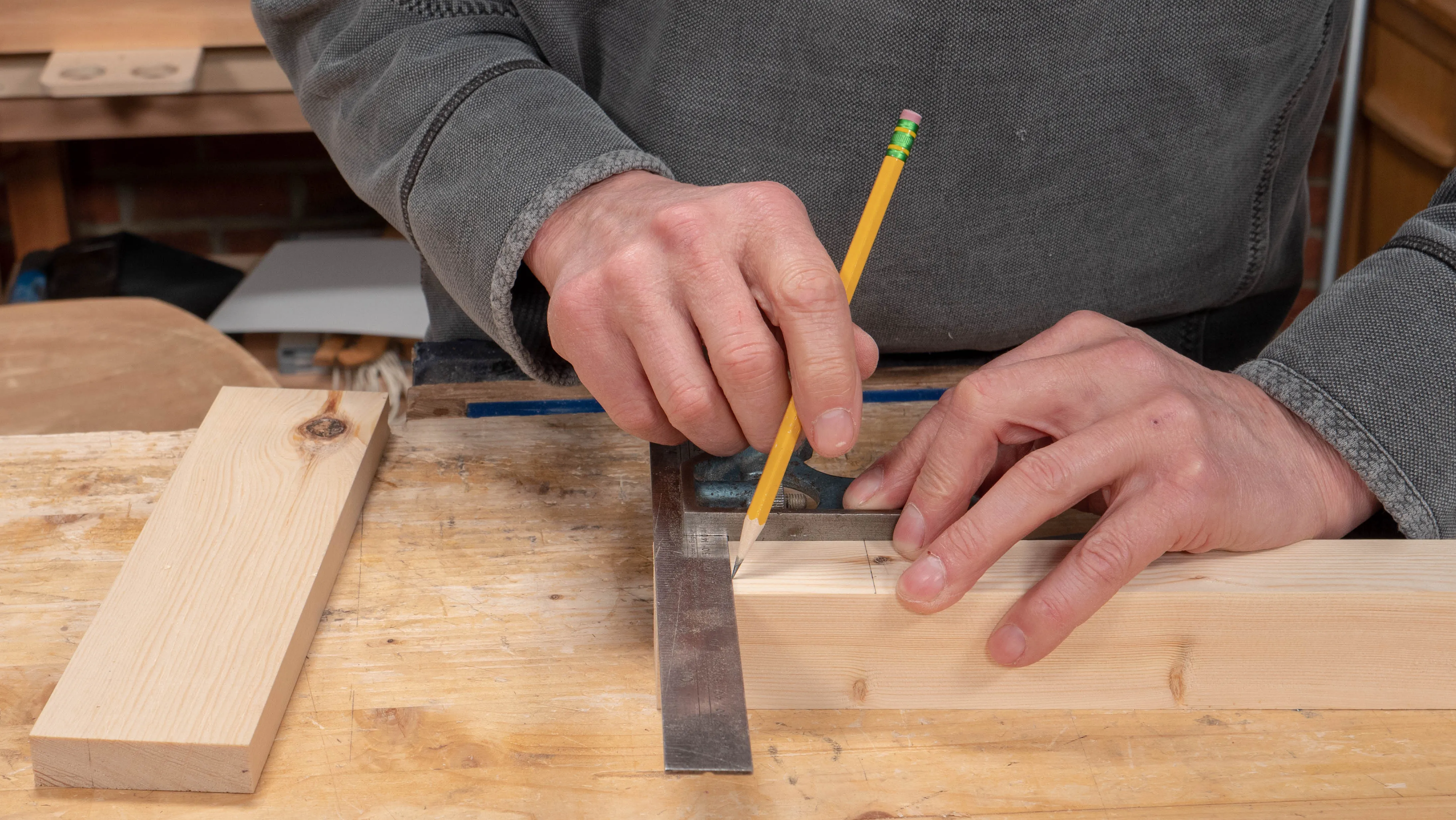 Begin by deciding on the arrangement of the parts. To lay out your mortise hole, pick the edge where you want your mortise to go and use the width of your tenon piece to mark the bottom of the mortise hole by flushing the top with your fingers and making a pencil line on the other side. Square this line across.