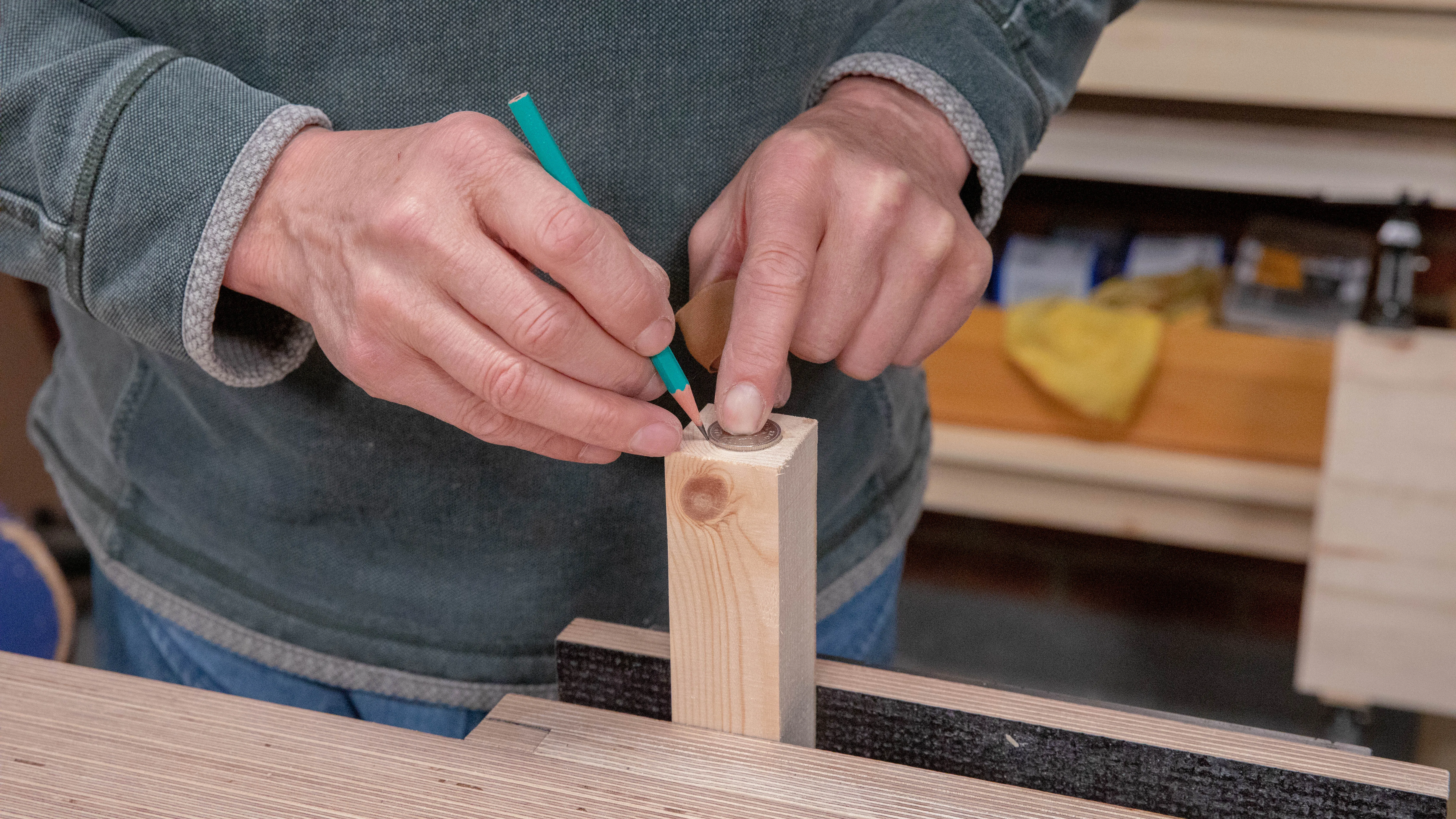 Use a coin or washer with a diameter a little under 1” (25mm, 10p in the UK works well) to draw around on both ends of the legs. Simply centre the circle by eye, since this is not crucial. The end that will really matter is the top, since you will ultimately have to achieve a decent fit through the whole thickness of the seat. However, this whole project is a training exercise, so try to work as accurately as possible even on the bottom, though this isn’t essential.