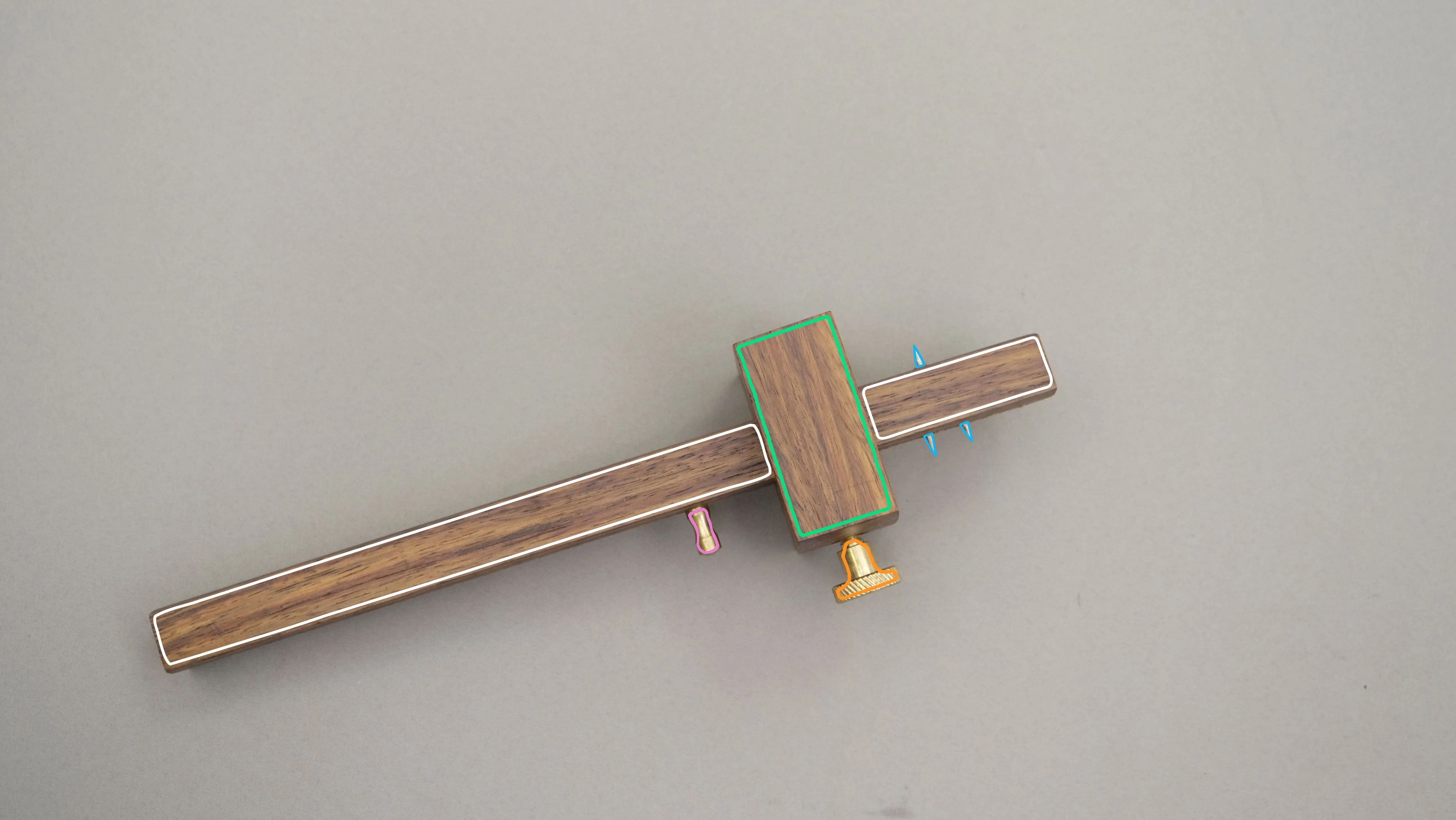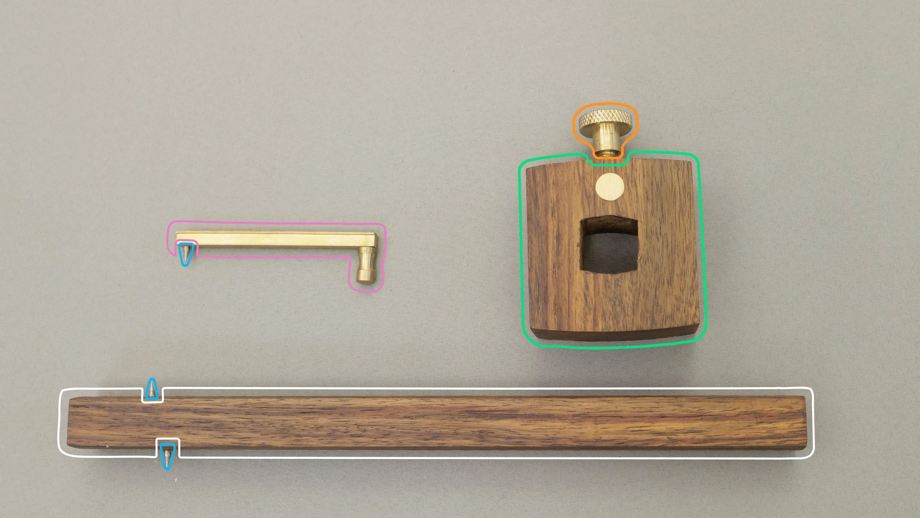 The combination gauge has 4 main parts: the wooden stem, the wooden stock, the setscrew and the marking pins. The stock has a lock system on it to allow it to keep the distance from the pin. This e...