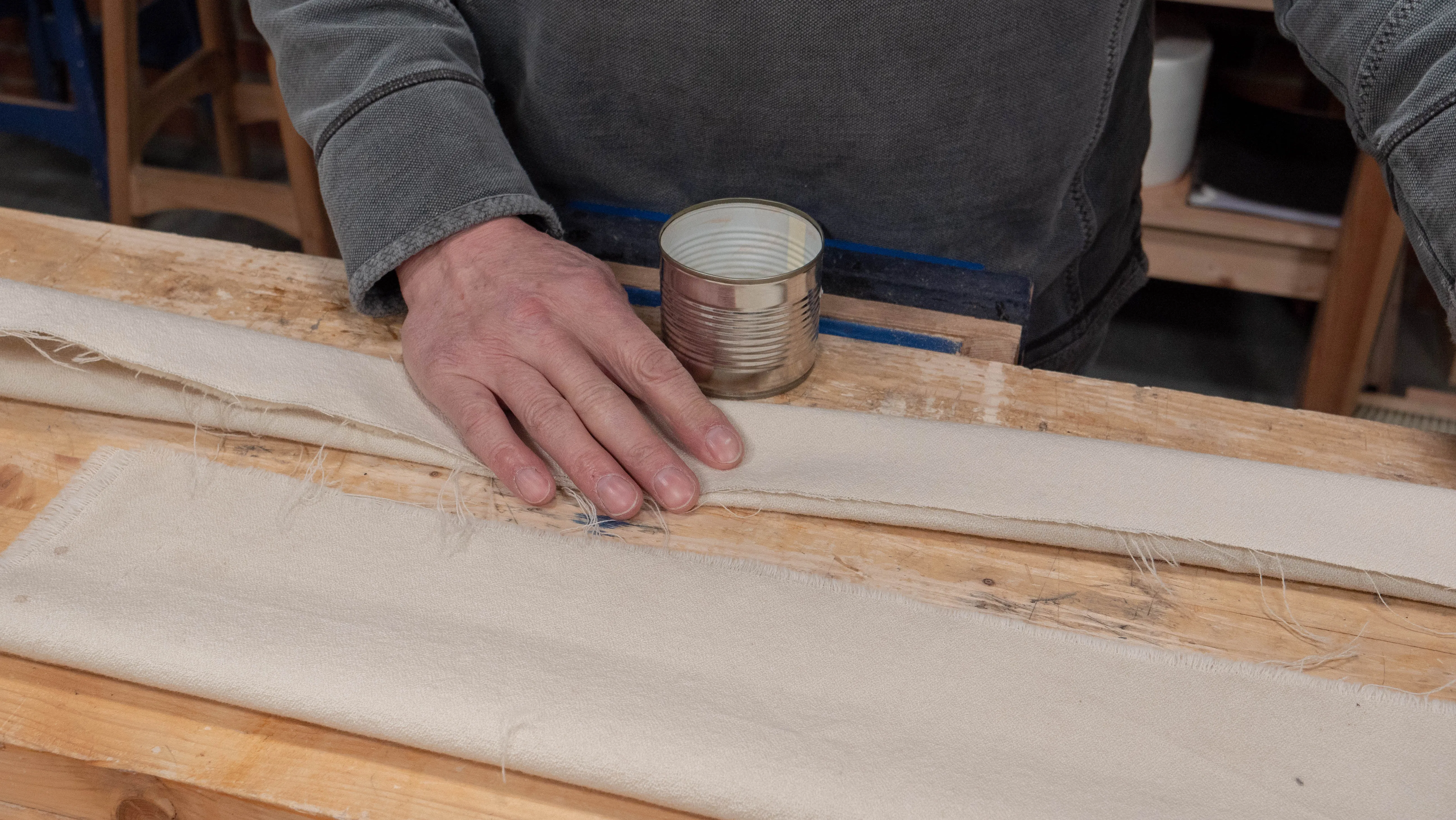 If your material has a torn edge, bring it into the centre so you have rounded edges. Then fold the bottom edge towards the centre too. Measure against your can, making it slightly taller than the height of your can.