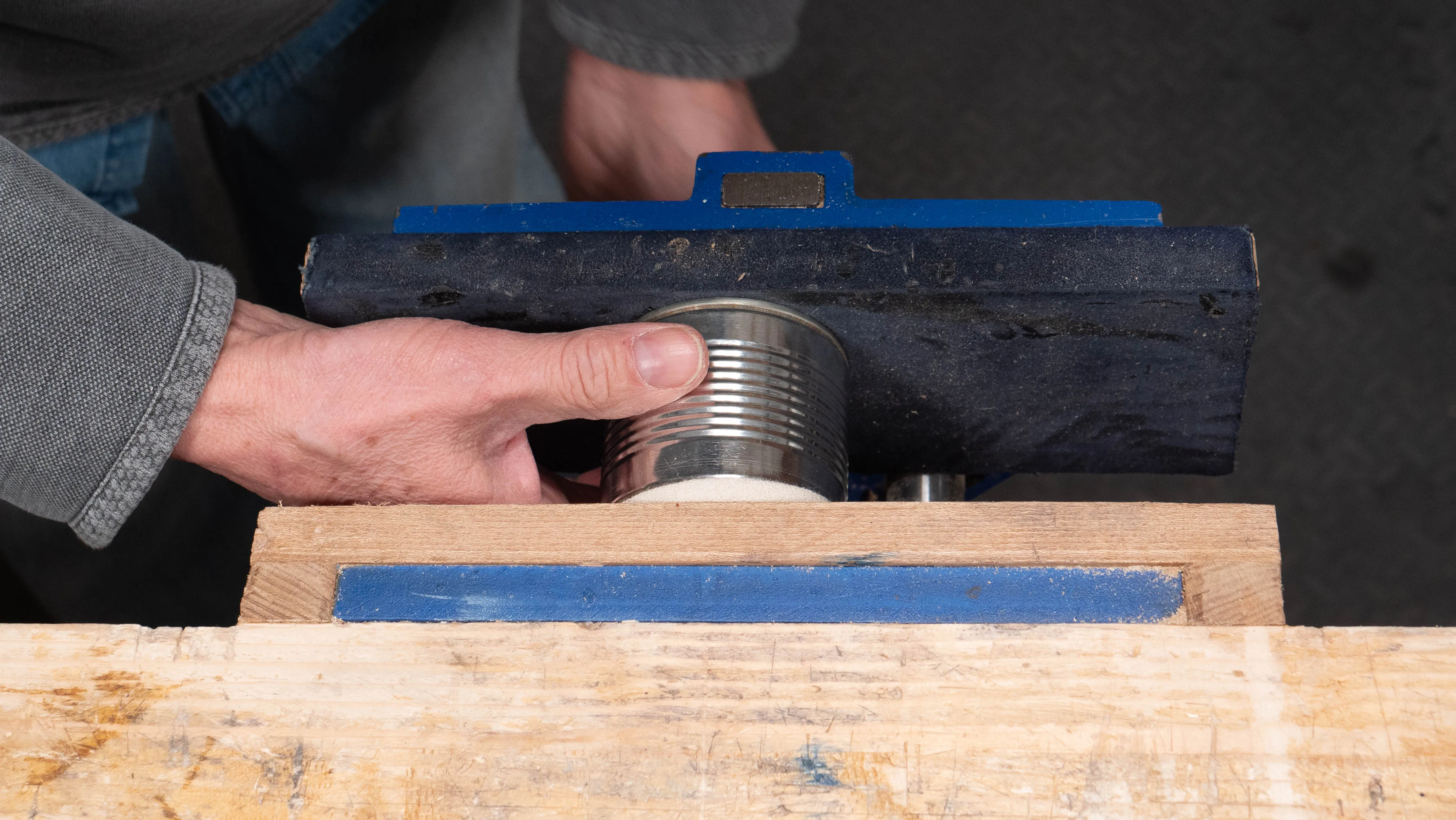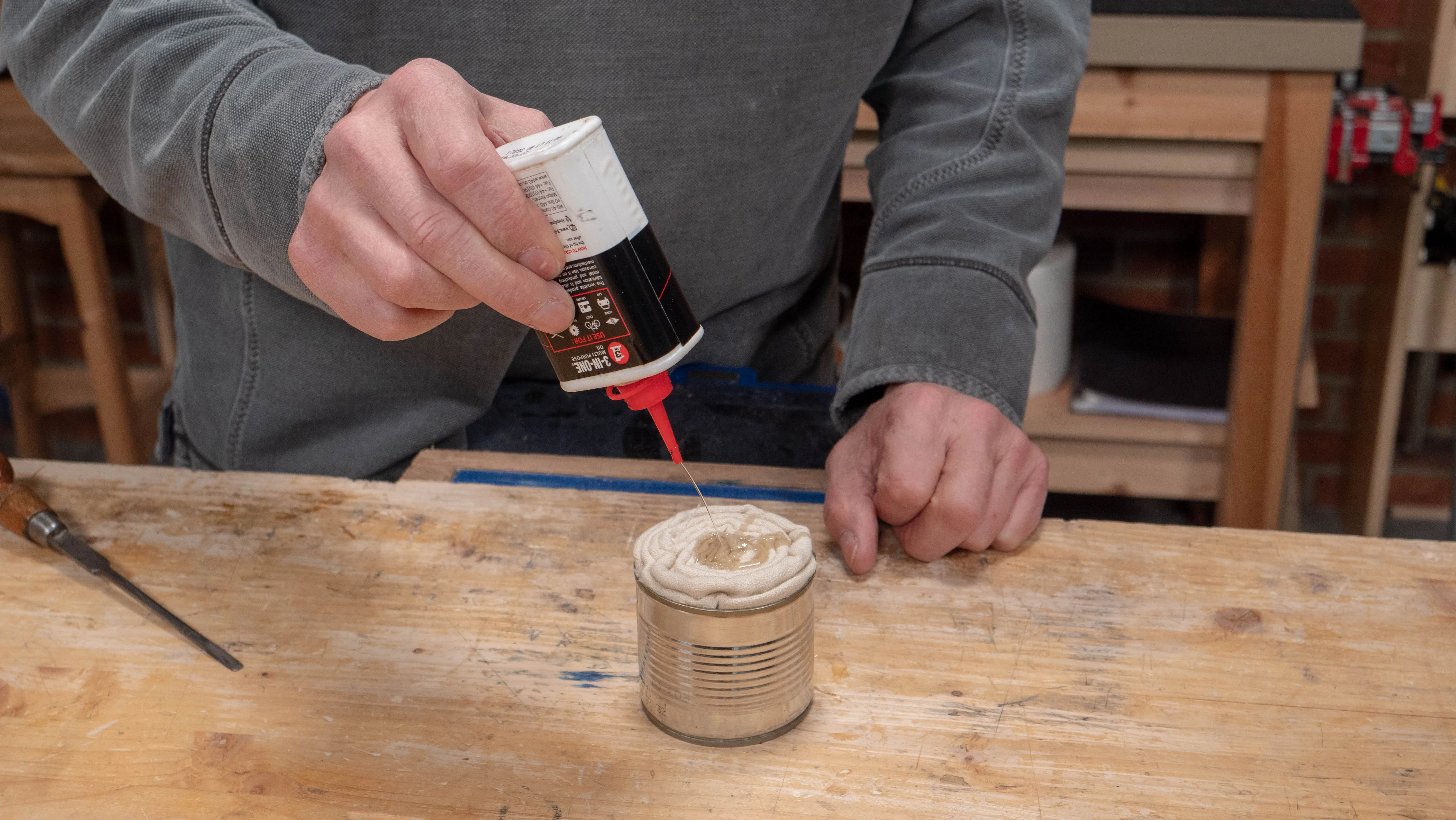 Put the rolled up rag into the can. Check it isn’t larger than the diameter. If it is too small, keep your wrapped up rag in the vise to keep it tight, and then get some spare cotton and wrap it around the existing roll to bulk it up. Keep checking the size against your can. It’s better to have it slightly too big rather than too small.