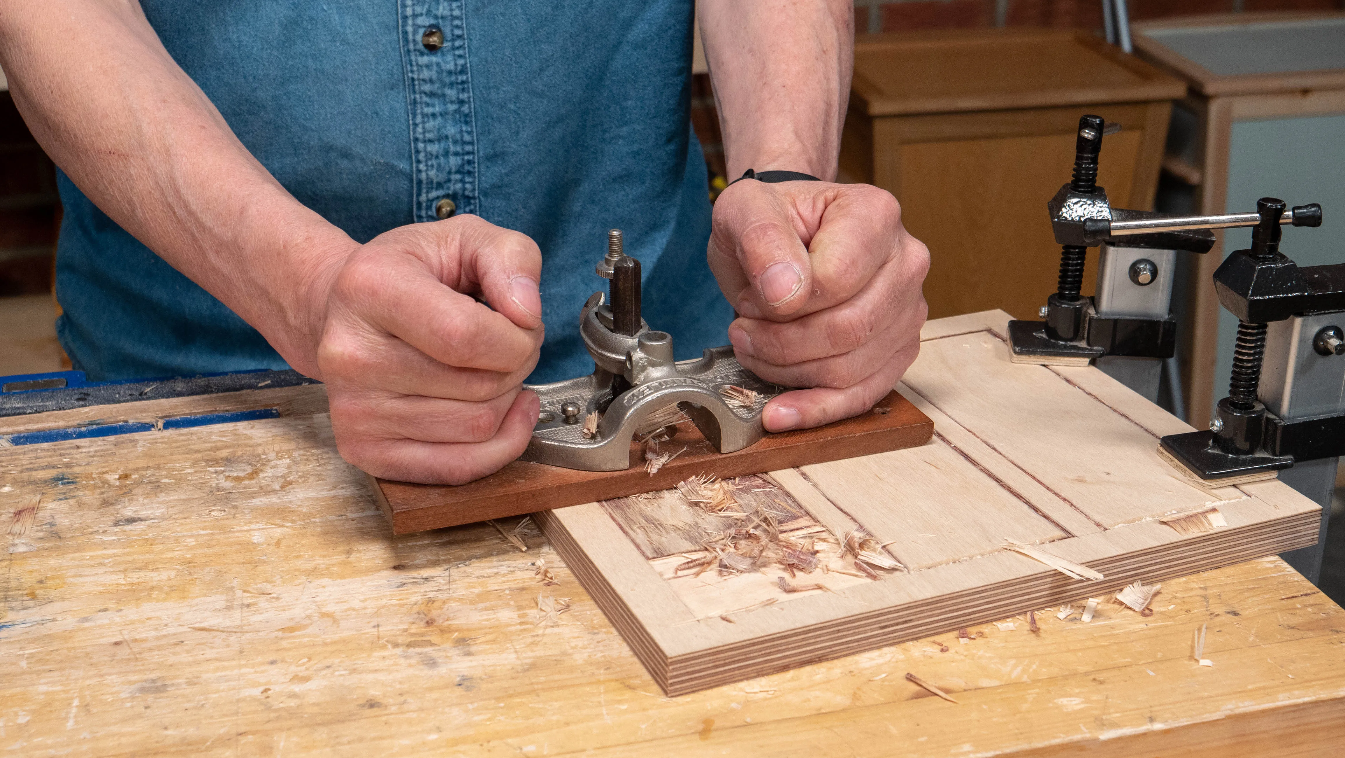 Use the router plane to reach the final depth of ⅛” (3mm). Paul recommends using a wooden router or one with a wooden sole if you have one. This is because the wood is less likely to mark the border of your holder.