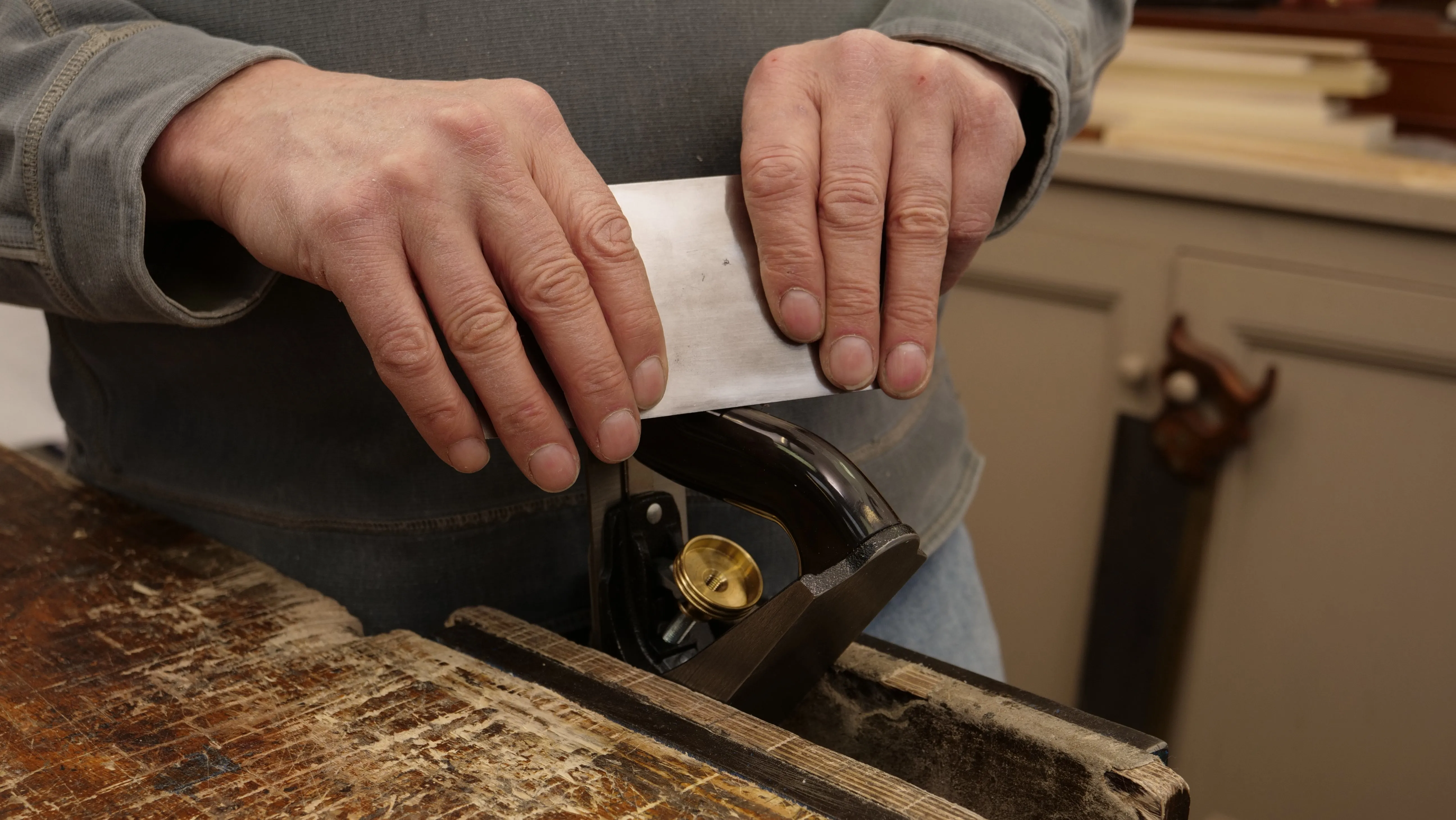 Once you have lined up the cap iron assembly onto the frog, place the lever cap on top and make sure the thumb lever has some resistance. If it is easy to press back, you will need to adjust the cutting iron assembly screw until the lever requires slight force to push back (it should “clunk” into place). Turn the screw clockwise to tighten and anticlockwise to loosen.