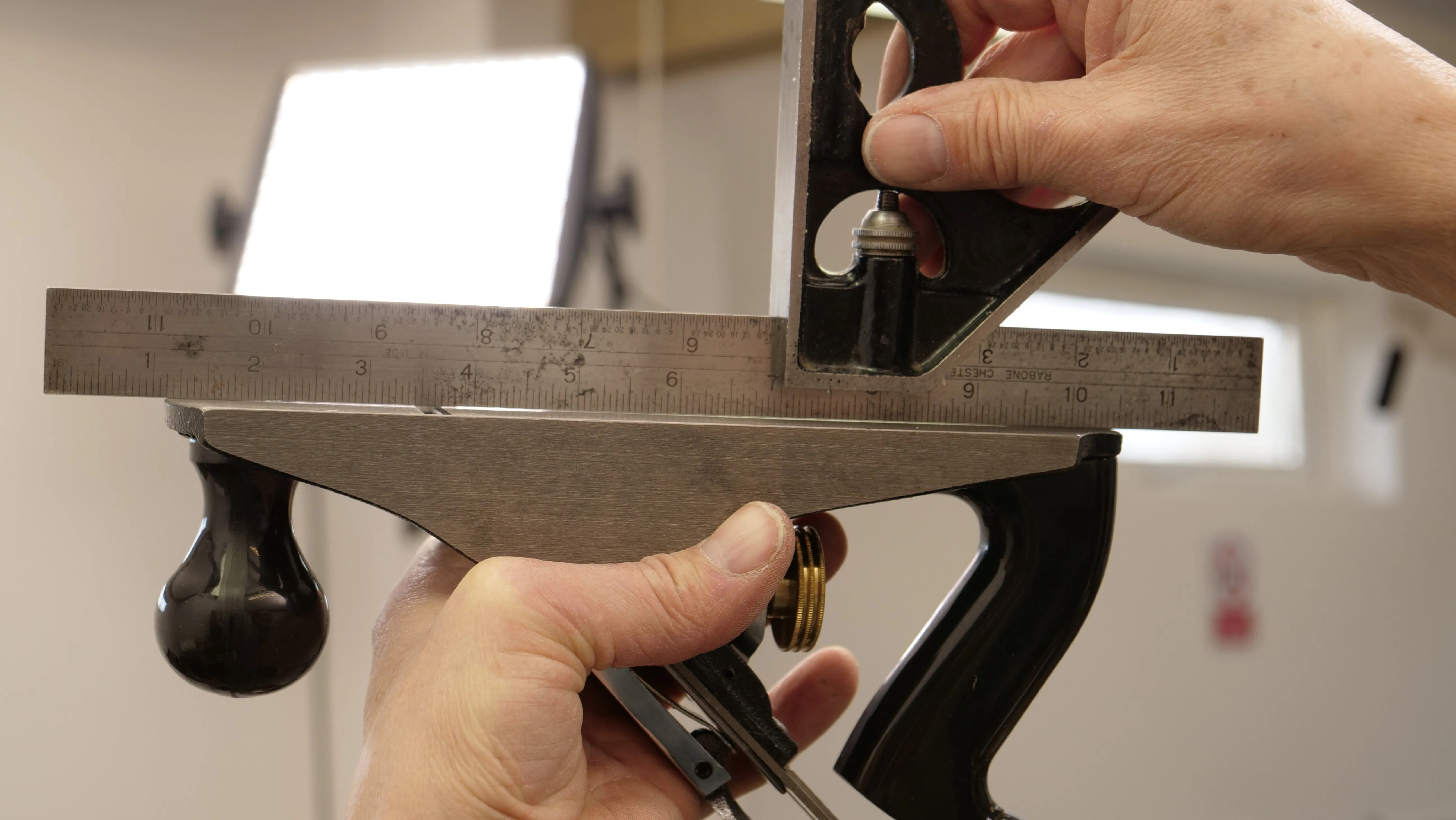 In order to adjust the frog, the two setscrews in the frog will need to be loosened to finger tight. You can then use a screwdriver to adjust the adjustment screw, which will move the frog forwards or backwards. Be sure to tighten up the two setscrews when you are happy with the position. You only need to adjust the frog very occasionally, for instance when you have difficult grain. You can get a cleaner cut when the frog is further forward, but this closes up the throat which disallows heavy cuts and thick shavings. For general use, you want the ability to change the plane set to include thicker shavings without the throat clogging. The blade lies on the bed (angled rake) of the frog. Adjust the frog until the underside of the blade, the bevelled side, sits in line with the back edge of the mouth opening. You can check this alignment using a straightedge, such as a steel rule or the edge of a square. When you are happy the angle is lined up, tighten the setscrews fully.