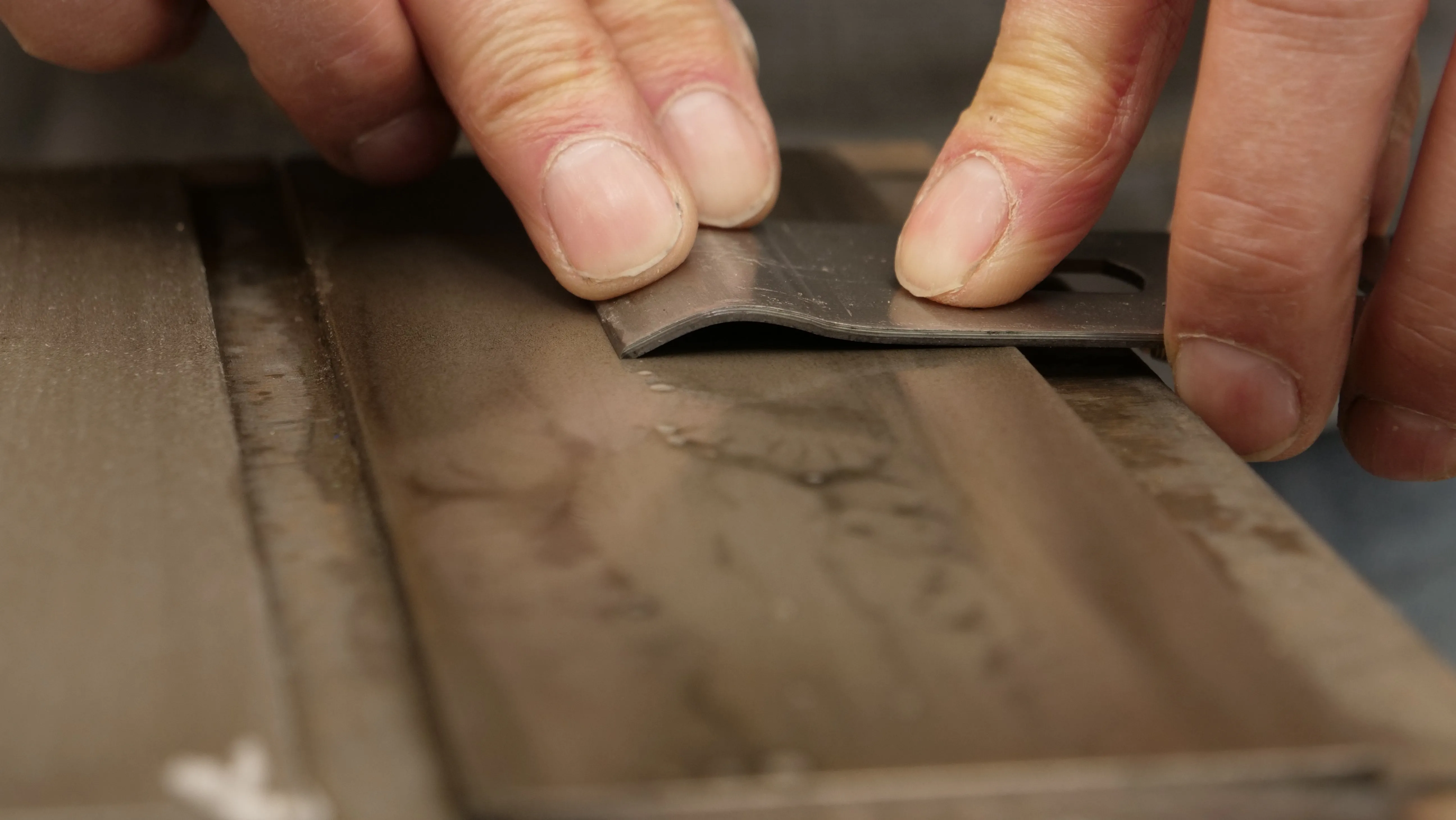Repeat the previous steps on the fine diamond plate, followed by the super fine level. These two levels will continue to refine the abrasions left by the previous levels of abrading. A burr will have formed at the cutting edge, carefully pinch the burr with your fingertips and the waste steel will come away in a narrow strip.