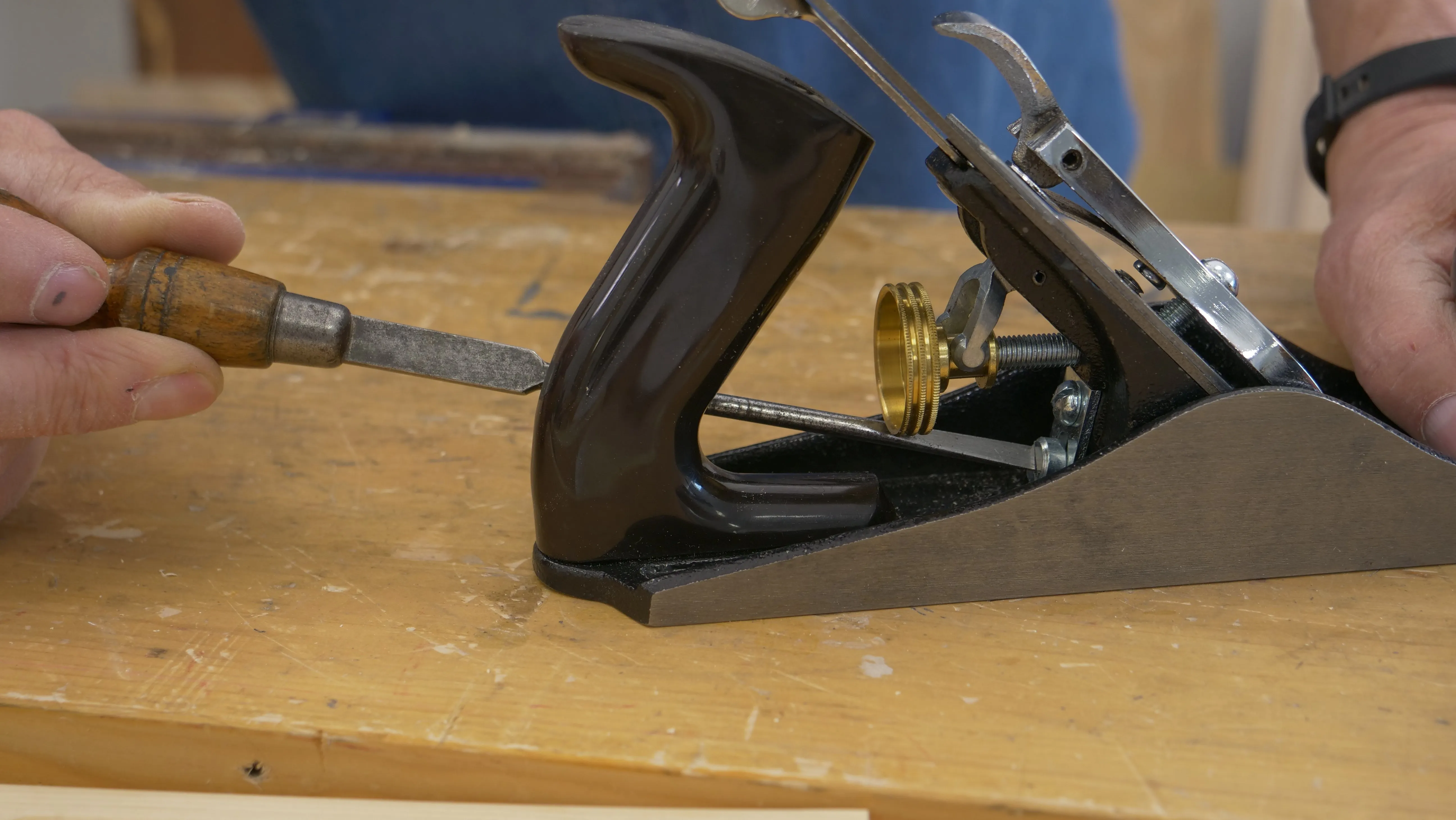 Once you have removed the cap iron and the cutting blade assembly, you will be able to see the inside face of the frog. You can adjust the position of the frog in relation to the sole using the adjustment screw at the back of the frog. This will move the frog back or forward, which adjusts the mouth opening.