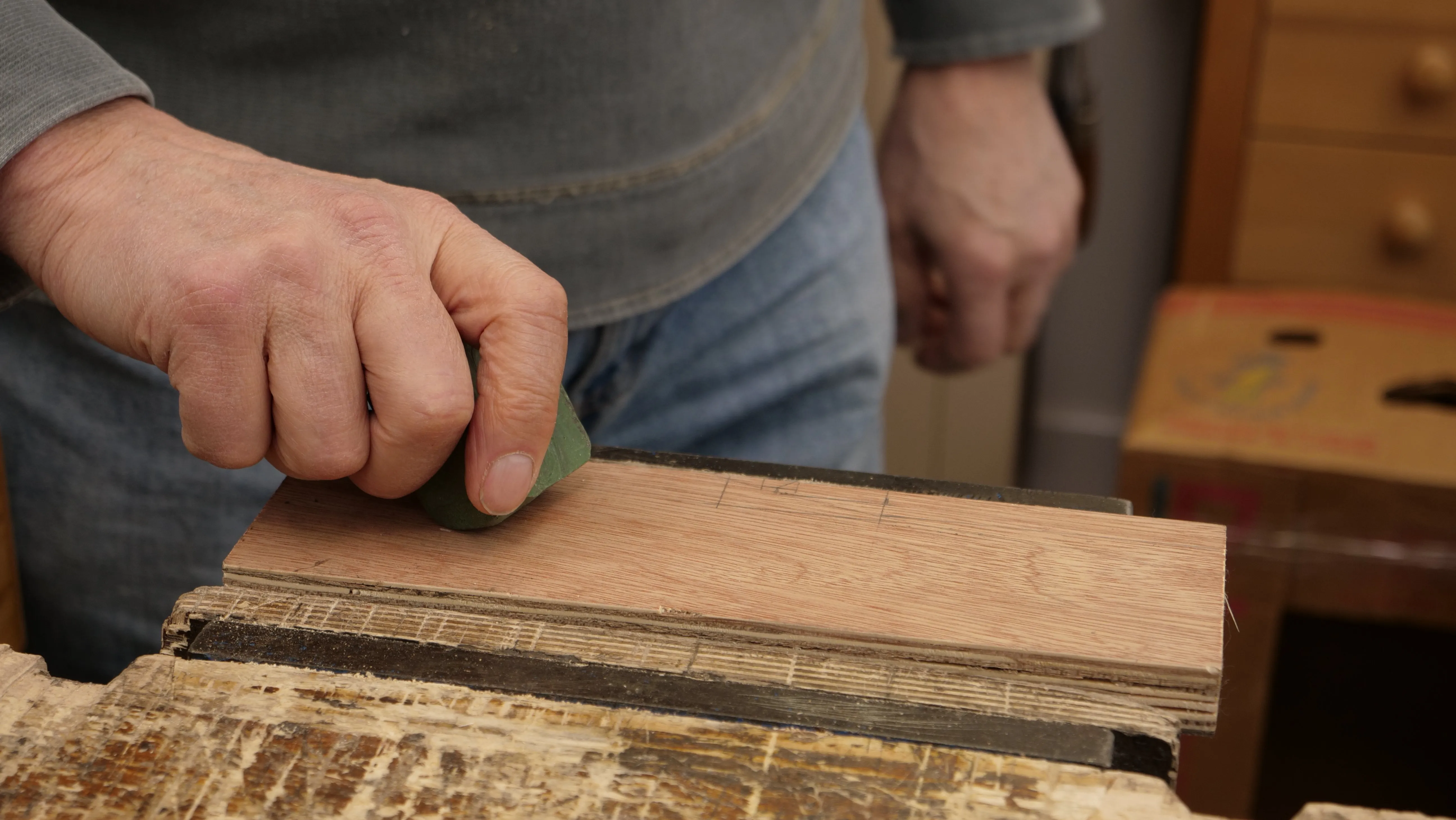 The leather will need replacing depending on how often you use it, but it should last roughly 2/ 3 years. If the leather gets too clogged with buffing compound, you can use the long edge of your chisel to scrape this away. Paul uses Silverline buffing compound, which costs approximately £8 for a large block. This should last you a lifetime. You can also get buffing compound from any engineering supply house, as they use it to polish metals. Veritas also make a buffing compound. Green compound is the one for abrading and polishing hard metals, such as carbon steel, stainless steel and tool steel.