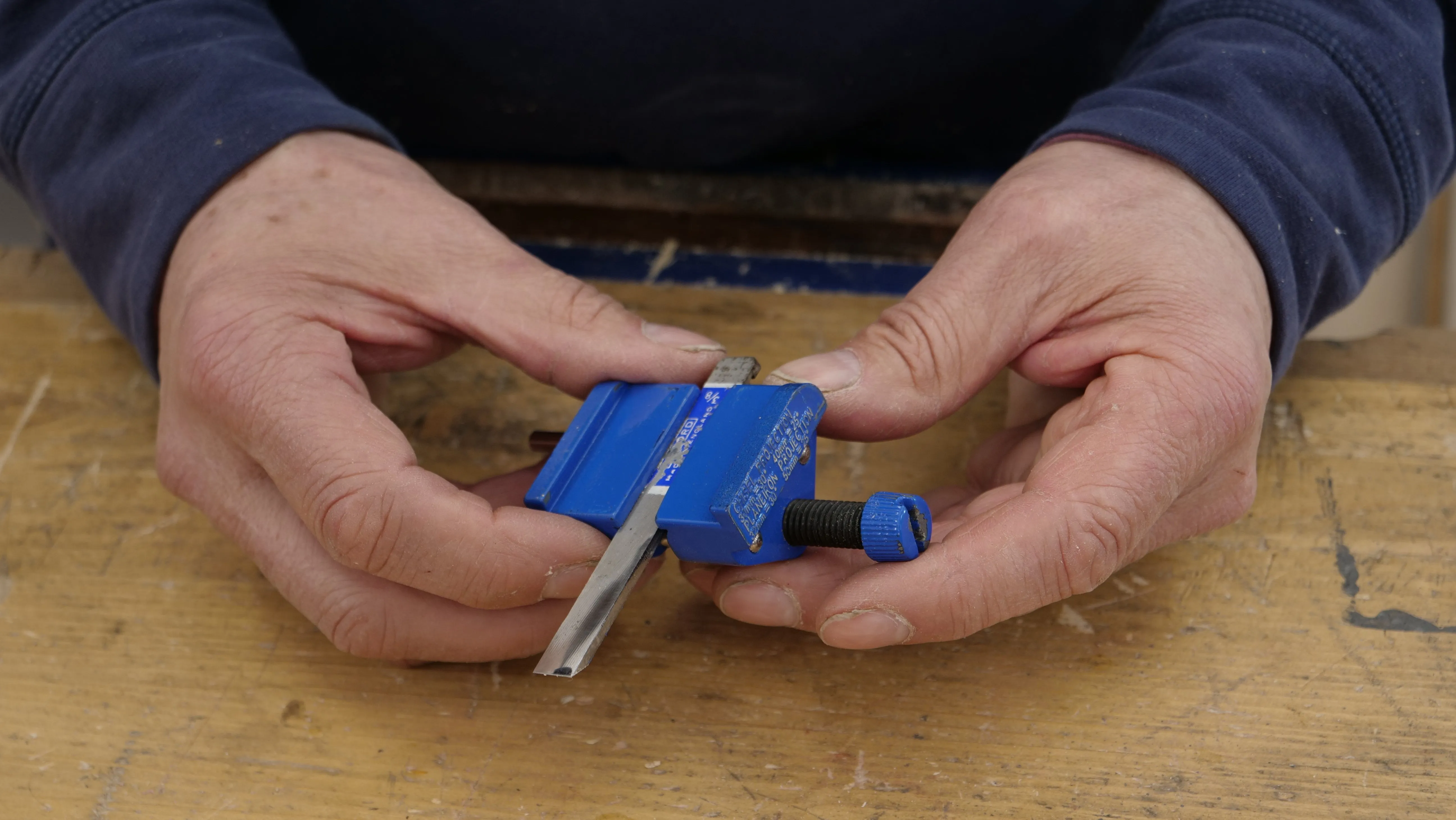 Although freehand sharpening can be quicker, Paul recommends these for beginners to help you reach the required angle when sharpening a blade. The honing guide has the ability to hold a blade of different thicknesses and at any predetermined angle. Use a protractor to help set the angle you want. It is important to not become reliant on this guide and to try and sharpen freehand every now and then to help master the skill. This will prove the most efficient method long term. You can buy a honing guide for £6/7. Paul uses a honing guide made by Eclipse.