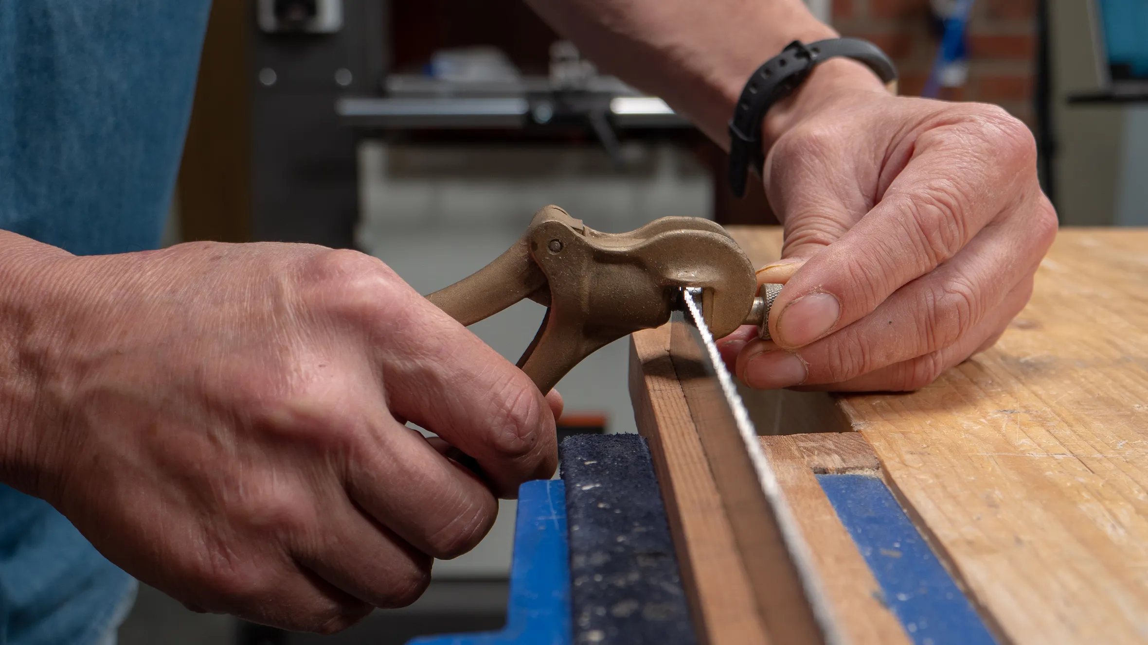 The sawset has one static arm and one moveable arm. When both the arms are squeezed simultaneously the punch emerges out from the body of the sawset and pushes the tooth over. Use your off hand to hold the knurled screw. This steadies the sawset as the punch engages the tooth being set. There is a tendency for the sawet to drift from the tooth otherwise.