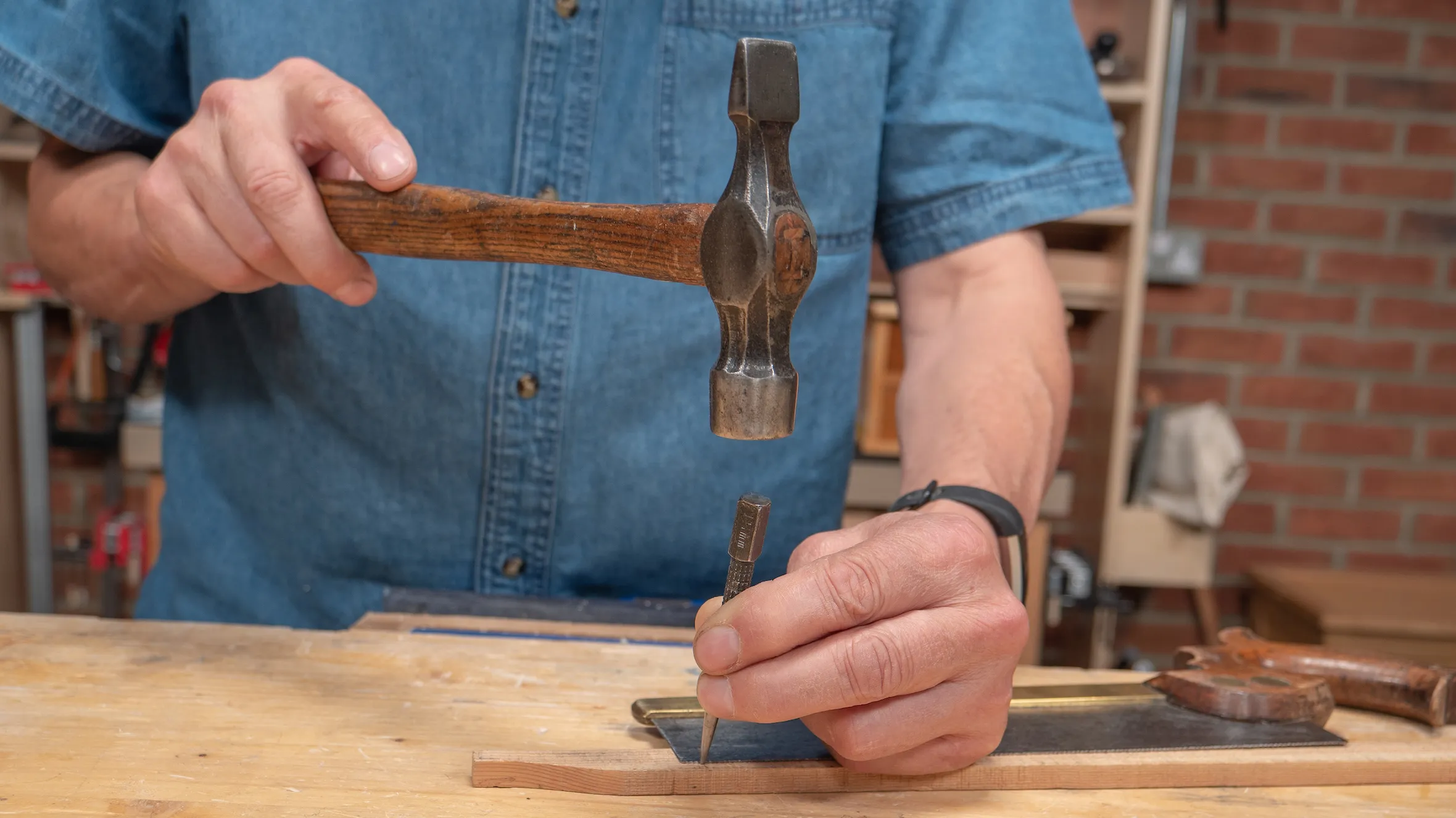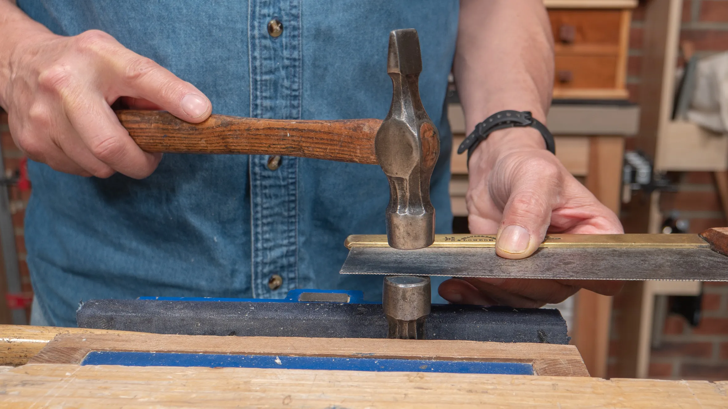 To test the set, make a cut with the saw and see if the saw plate wobbles in the cut. If it does wobble, this can mean the teeth are over set. An uneven sawset often results in a curved cut, so it is necessary to correct this by evening out the set. Secure a hammer in the vise with the hammer face above the top of the vise jaws. Place the end teeth of the saw plate horizontally across the face of the hammer. Use a second hammer to tap all of the teeth against the first hammer face. Use consistent pressure and gradually move the saw teeth between the hammer faces, ensuring that all the teeth receive a hammer tap. This process usually leaves enough set for the saw to cut effectively and progressively. Depending on the previous set, hammer correction can sometimes completely remove any existing set, requiring you to use the sawset on the saw once more.